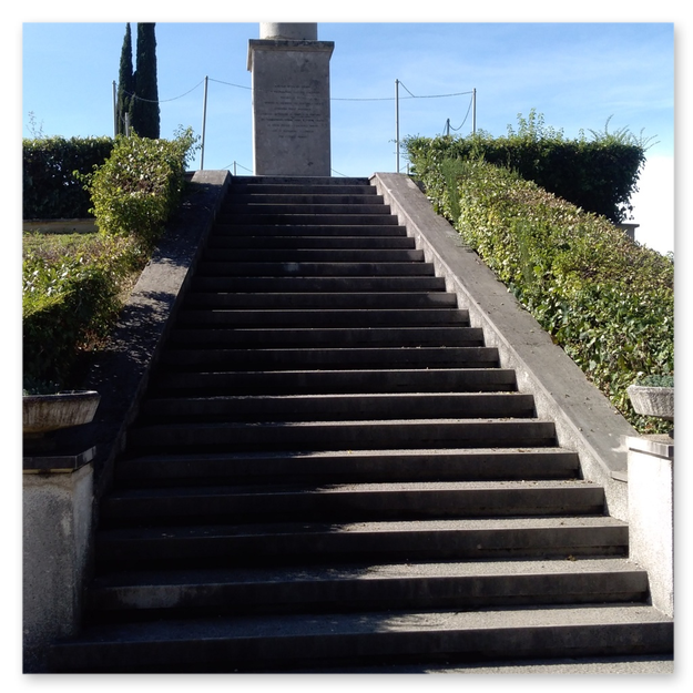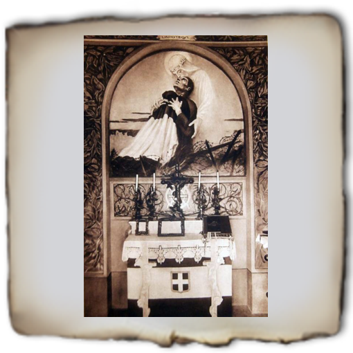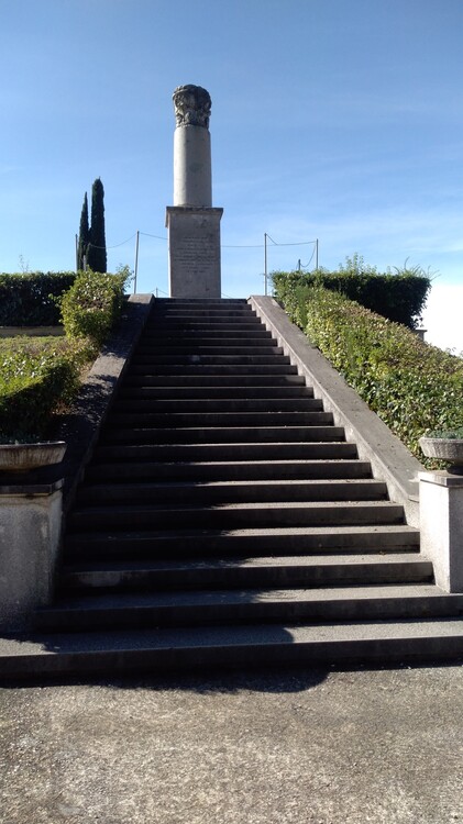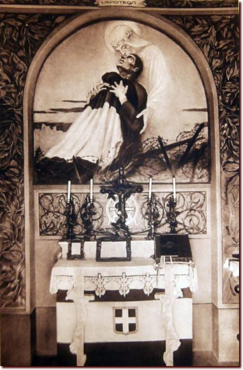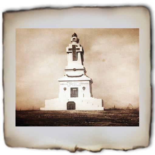 La cima del colle è stata invece spianata per ospitare un monumento crocifero eretto sopra una cappella votiva sormontata da un obelisco a forma di faro dal quale partono fasci di luce. Il Duca d'Aosta scelse apposta la cappella, decorata con affreschi pietosi e dolenti di G. Ciotti, tra cui si ricorda il fante morente nelle braccia del Cristo, che rimanda alla salita al Calvario come sua ultima dimora.