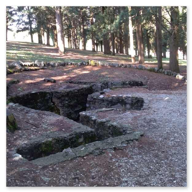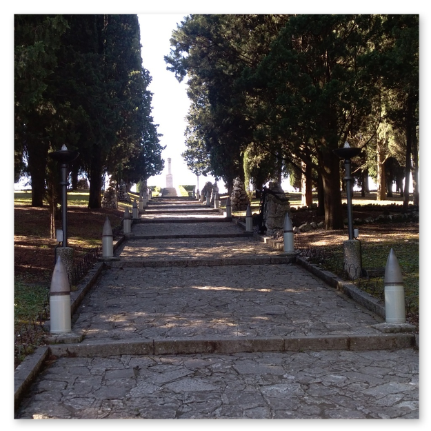 La forma della collina ad andamento ascendente e concentrico è molto probabilmente il primo spunto offerto per la disposizione del cimitero. L'altura situata di fronte all'altipiano carsico è stata modellata in sette balze concentriche che alludono ai gironi danteschi, la cui lunghezza lineare raggiunge i ventidue chilometri. Lo spazio è poi diviso in sette ampi settori circolari che declinano dalla sommità e sono separati da ampi vialoni, anch'essi discendenti a raggiera.